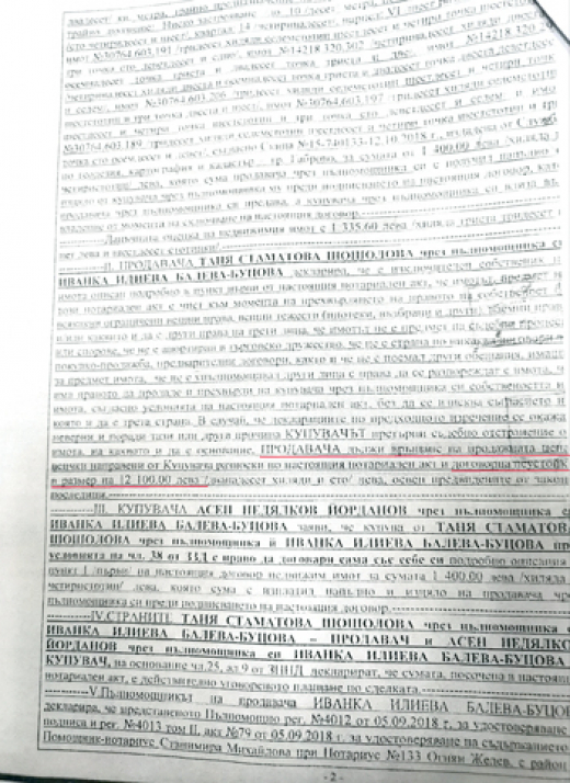 2. Може да се твърди съвсем обосновано, че щом в полза на Асен Йорданов е уговорена неустойка, която надхвърля над 10 пъти официално записаната в нотариалните актове цена, то реалната продажба на двете дворни места в село Зелено дърво не е за смешната сума от 2410 лева, фигурираща в актовете, а за общо 25 510 лева, от които „на тъмно“ са цели 23 100 лева и върху тях не са платени данъци и такси.