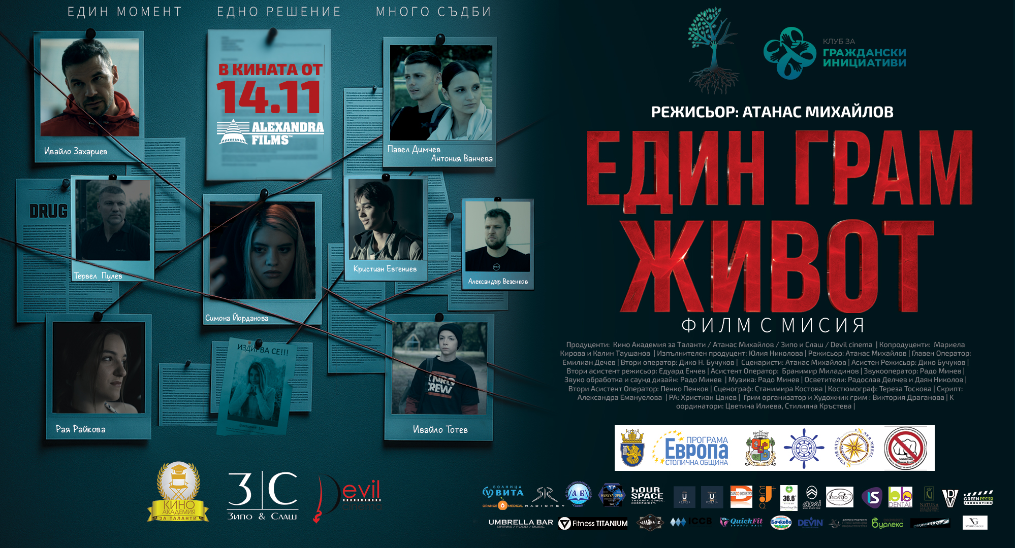 Новият филм на режисьора Атанас Михайлов – „Един грам живот” (продуценти: Атанас Михайлов, Кино академия за таланти, Devil Cinema, Зипо и Слаш) насочва светлината на прожекторите към един от най-наболелите проблеми в съвременното общество – употребата на наркотични вещества. Истинските събития, които представя, разкриват дълбоките лични, семейни и социални последствия от дрогата и засягат дълбоко връзката дете – родител, родител – дете. „Един грам живот” ще е в кината в цялата страна от 14 ноември. В ролите ще видим Ивайло Захариев, Калоян М. Патерков, Тервел Пулев, Доби Главинчева, Симона Йорданова, Павел Димчев, Лео Панов, Александър Везенков – баскетболист номер 1 в България и Европа.