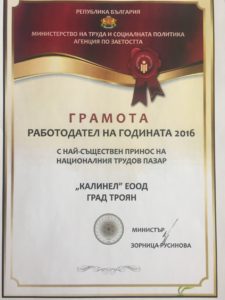 „Калинел” ЕООД, гр. Троян получи отличието в категорията „Работодатели с най-съществен принос на националния трудов пазар“ /През 2007 година „Калинел“ ЕООД взима за първи път този приз/. Фирмата е наградена за приноса и към осигуряването на заетост на безработни лица на трудовия пазар в обхвата на бюрата по труда в Троян и Червен бряг. От началото на 2016 г. фирмата е заявила 104 работни места и е осигурила устойчива заетост на 75 безработни лица. Една трета от новонаетите лица са от община Червен бряг, която е с високо равнище на безработица. Осигурена е работа на 25 младежи до 29 години и на 7 продължително безработни лица. На всички работници от общини Априлци, Троян, Ловеч и Червен бряг е осигурен безплатен служебен транспорт.