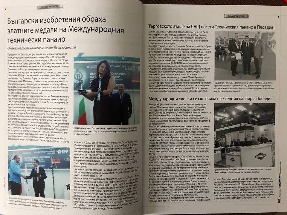 За пореден път Елпром Троян, символът на Електротехническата промишленост в България е на корицата на специализирано издание, този път в престижното издание Машиностроене и Електротехника. Това е престижното издание, което представя технологичните новостите в индустриалния свят. Елпром през изминалата 2018г. получи безпрецедентните 4 златни медала в рамките на Международния Технически Панаир в Пловдив за Иновации.