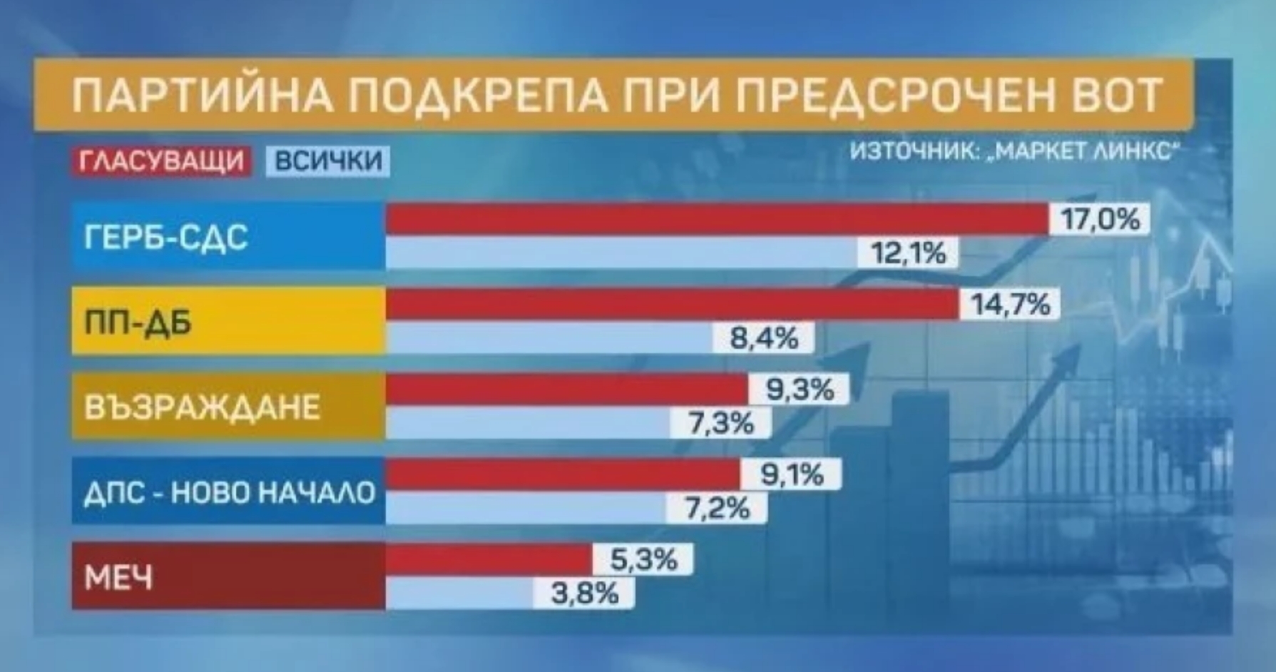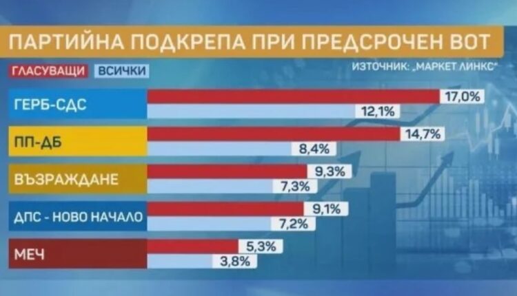 При предсрочни парламентарни избори ГЕРБ-СДС отново ще са първа политическа сила със 17%. Втори ще са ПП-ДБ с 14,7%, трети – „Възраждане“ с 9,3%, четвърти – ДПС с 9,1% подкрепа, пети – МЕЧ с 5,3%, шести – БСП с 4,7% подкрепа.