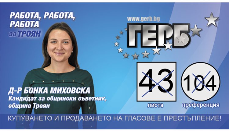 Казвам се Бонка Миховска. На 28 години съм, неомъжена, родена съм в град Троян. Завърших с отличие ПЕГ „Екзарх Йосиф I“ в гр. Ловеч, а висшето си образование получих в Медицински университет – София, специалност „Дентална медицина“. От три години живея постоянно в Троян и работя в собствена практика. Стремя се непрекъснато към личностно и професионално развитие и усъвършенстване. В момента съм най-младият лекар по дентална медицина в нашата община. Кандидатирам се за общински съветник с ясното съзнание за голямата отговорност, която поемем. Искам родния ми град да бъде място, в което младите хора да бъдат щастливи, да отглеждат децата си, да имат работа и време за забавления. Ще работя за по-добра социална политика в Общината, по-качествено здравеопазване и по- високи доходи за хората.