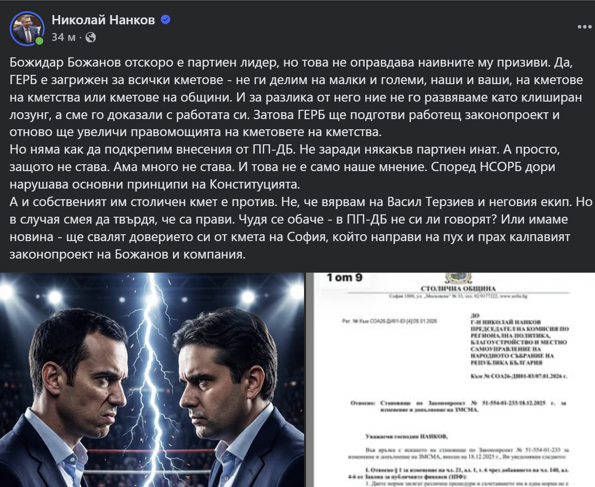 А и собственият им столичен кмет е против. Не, че вярвам на Васил Терзиев и неговия екип. Но в случая смея да твърдя, че са прави. Чудя се обаче – в ПП-ДБ не си ли говорят? Или имаме новина – ще свалят доверието си от кмета на София, който направи на пух и прах калпавият законопроект на Божанов и компания.