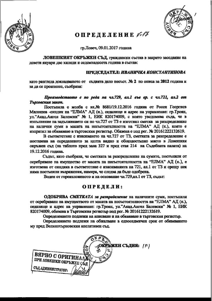 Днес се свързахме със синдика на „Елма“ АД в несъстоятелност. Той заяви, че в обявения 14-дневен срок няма постъпили възражения относно изплащането на заплатите на елпромци. Синдикът ни увери, че всеки момент очаква съдът в Ловеч да излезе с определение за изплащане на заплатите, т.е синдикът да започне изплащането на парите. Решението на съда ще бъде качено в търговския регистър.
