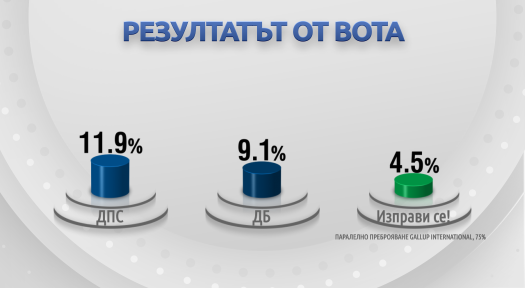 Данни на социологическите агенции „Галъп“ и „Тренд“ от паралелното преброяване при 75% изпълнение на извадката показват, че коалицията ГЕРБ/СДС печели днешния парламентарен вот. Партията „Има такъв народ“ става втора политическа сила.