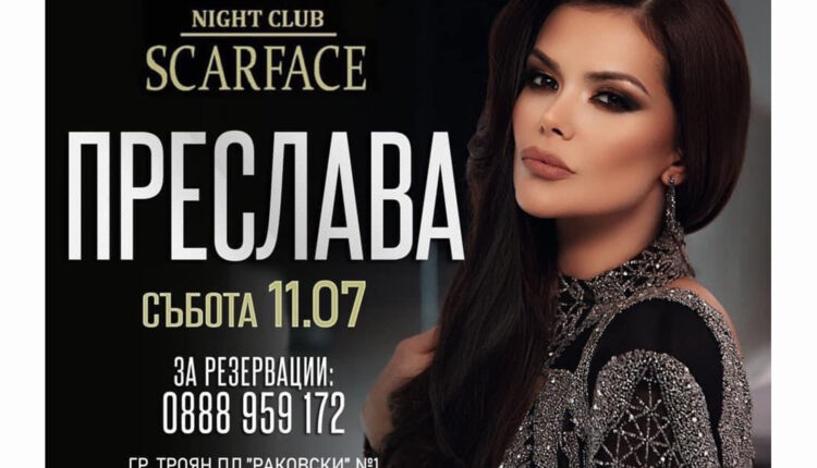 Мега звездата на българския поп-фолк Преслава ще гостува в Троян. На 11 юли заповядайте в нощен клуб SCARFACE, за да чуете едни от най-големите нейни хитове и да се забавлявате до зори. Преслава е една от най-обичаните и любими изпълнители на всички фенове на поп фолка. Предвид големият интерес към нейното участие, можете да запазите места на телефон: 0888 959 172