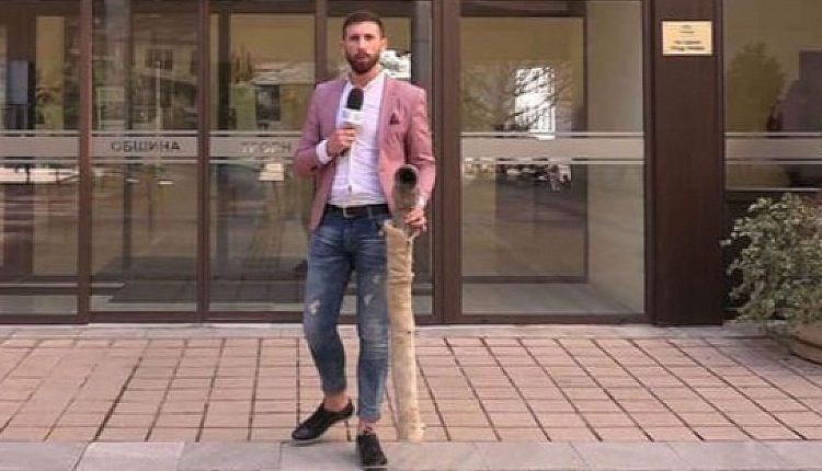 „Разследващият журналист“ Христо Гешов развява тръбата си на входа на Община Троян