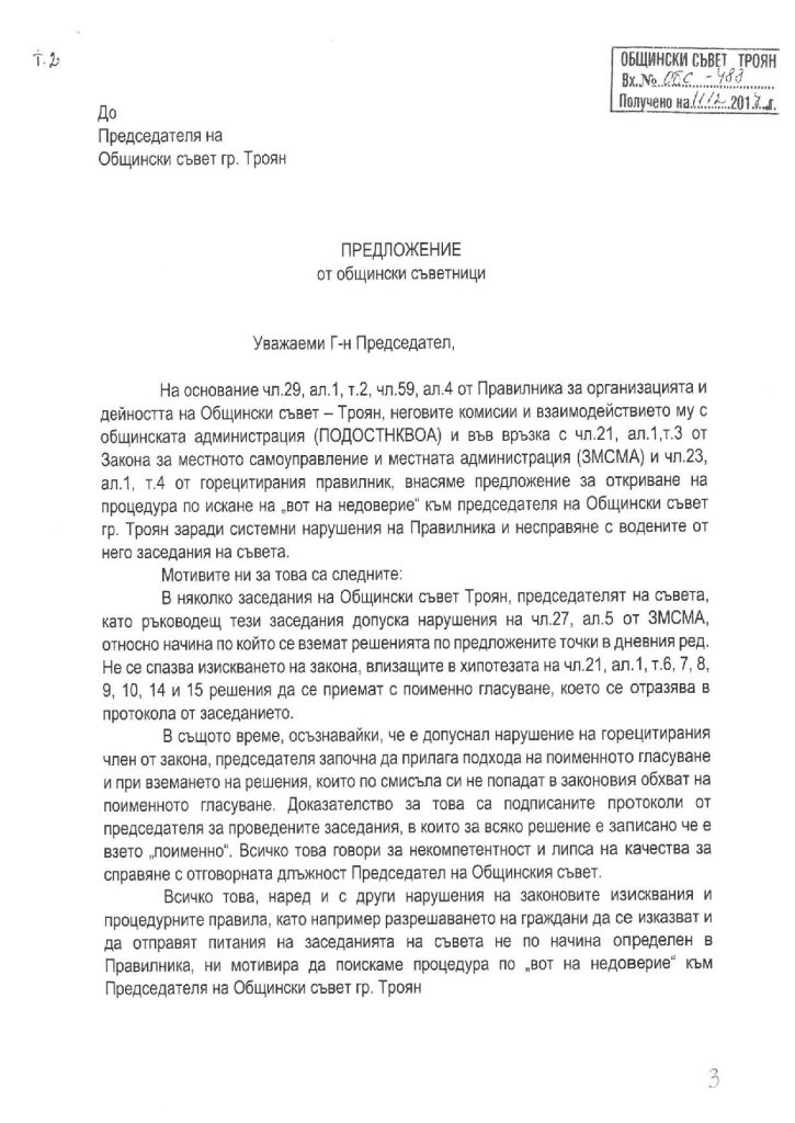 Публикуваме мотивите на общинските съветници от ГЕРБ за искането вот на недоверие на председателя на ОбС-Троян: