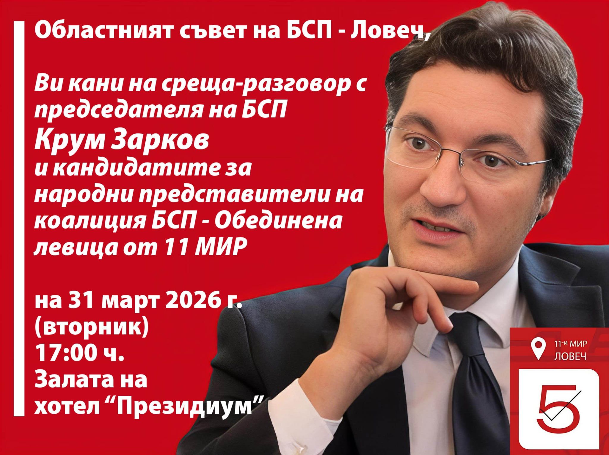 На 31 март /вторник/ в залата на хотел „Президиум“ от 17:00 часа ще се проведе среща-разговор с председателя на БСП Крум Зарков. На срещата ще присъства цялата листа на БСП-Обединена левица за 11 МИР-Ловеч с водач Николай Бериевски. Ще имате възможност да чуете програмата на БСП, както и да зададете въпроси.